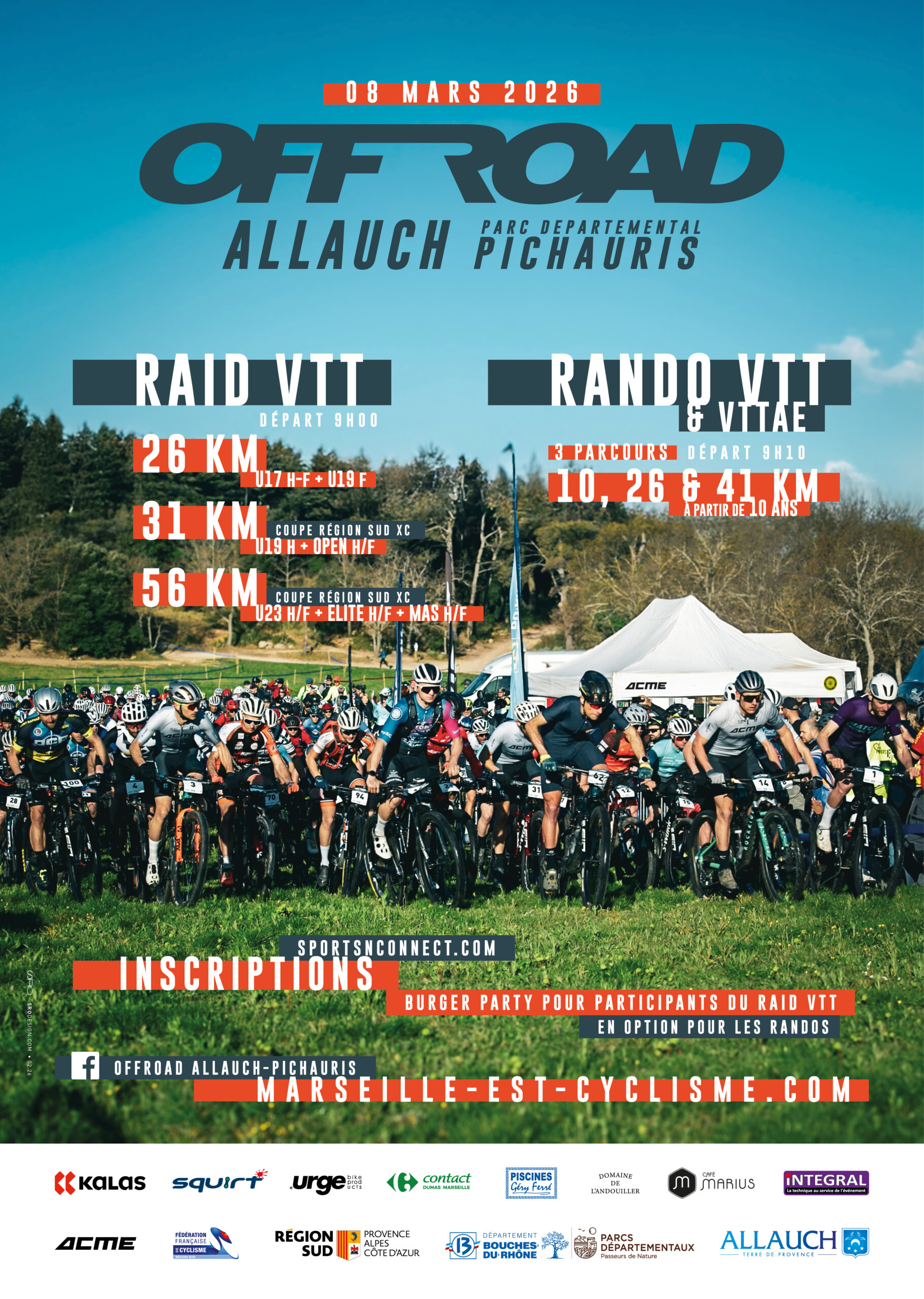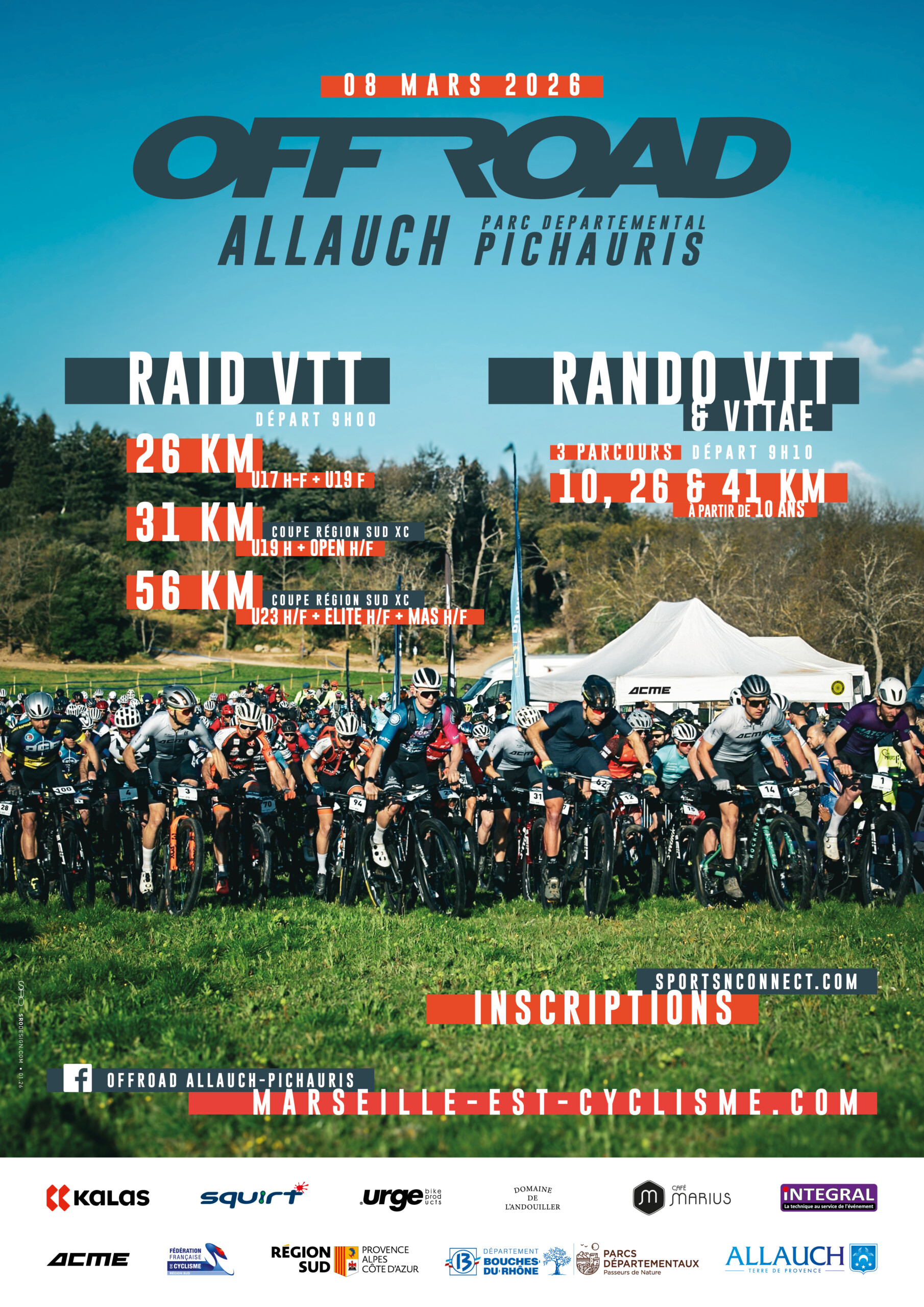 Avec la collaboration du département des Bouches du Rhône pour la mise à disposition du Parc Départemental de Pichauris et de la municipalité d’Allauch, l’ACME, organisera le 08 Mars 2026, le 3ème Raid VTT OFFROAD ALLAUCH – Parc départemental de PICHAURIS. Cet événement VTT comportera une randonnée familiale ouverte à tous (VTT et VTTAE) et une compétition VTT chronométrée type marathon qui sera le support de la Coupe Région Sud XC à partir des U19.